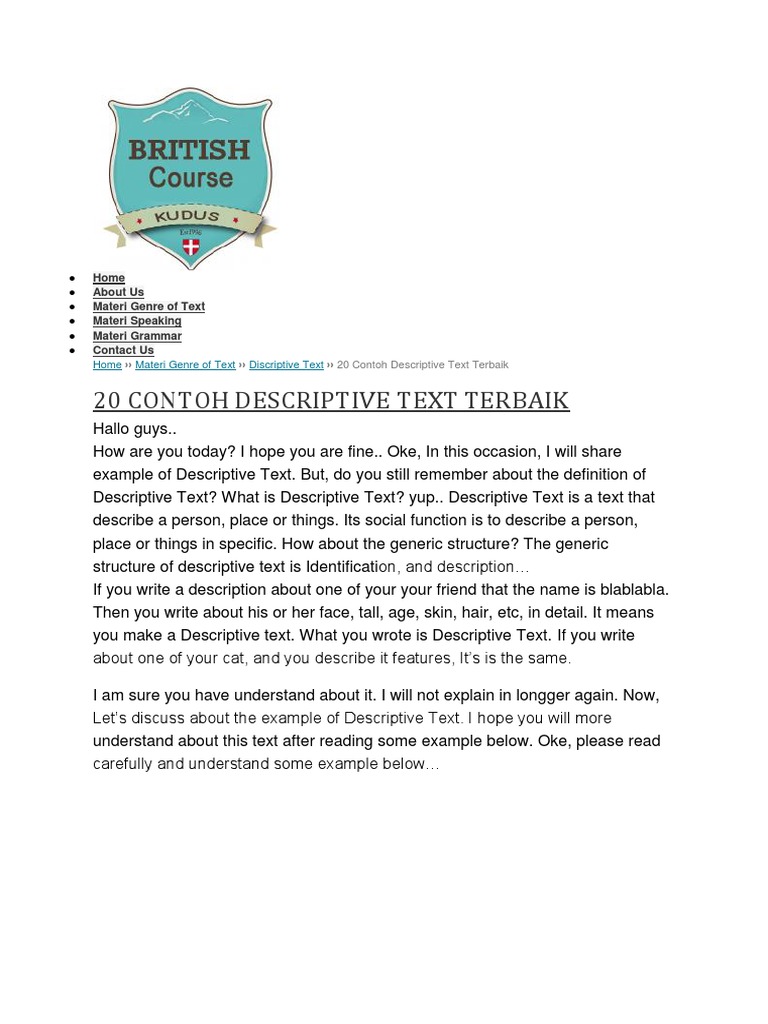 · Contoh dari report text dengan topik tempat wisata yaitu sebagai berikut: Many people mistakenly believe that Ratu Boko is a temple, like most temples in Yogyakarta. In fact, Ratu book is a royal or palace complex, so that some people call it the Ratu Boko Palace. Ratu Boko is located on a hill, which is around meters above the sea · Contoh Descriptive Text Bahasa Inggris Tentang Tempat Wisata Taman Safari. 5 Contoh Descriptive Text Tentang Tempat Wisata Tourism Place Dalam Bahasa Inggris Dan Artinya Jagoan Bahasa Inggris Teks dercriptive itu satu kelompok dengan teks report 31 Contoh Report Text Singkat 2 Bahasa Generic Structure 5 Contoh Descriptive Text Tentang T
